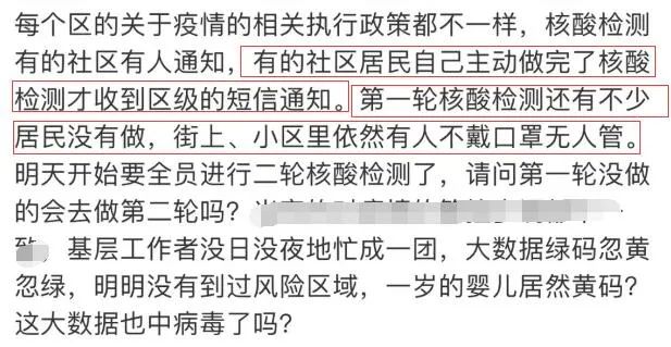 核酸檢測秩序混亂,主要靠自覺,一輪檢測沒有全覆蓋,二輪又已經開始了,檢測結果也幾天沒有出來。