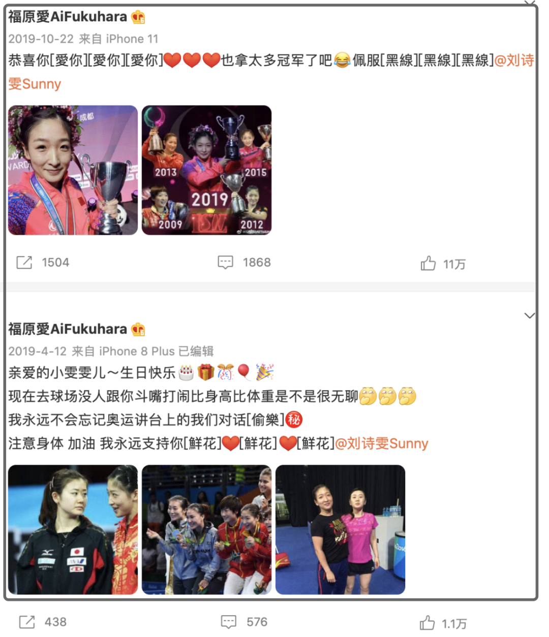 作為中日體育文化交流的使者和熱愛乒乓球的女孩,福原愛從小就到中國打乒乓超聯賽,在那裏認識了劉詩雯。