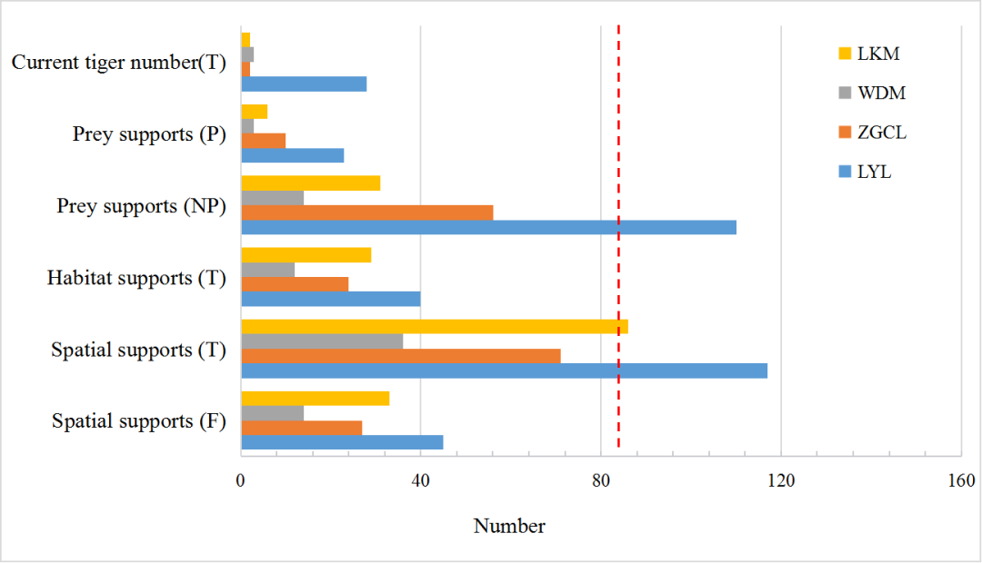 各個棲息地景觀斑塊內當前東北虎個體數量和可容納數量 ©東北林業大學姜廣順課題組