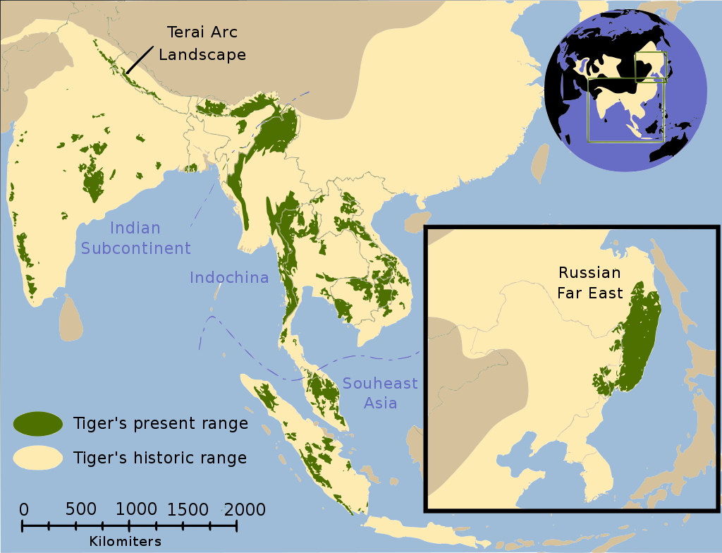 這個範圍從東至西超過2000公里,由南到北超過1500公里。華南虎的分佈面積比東北虎大許多倍。