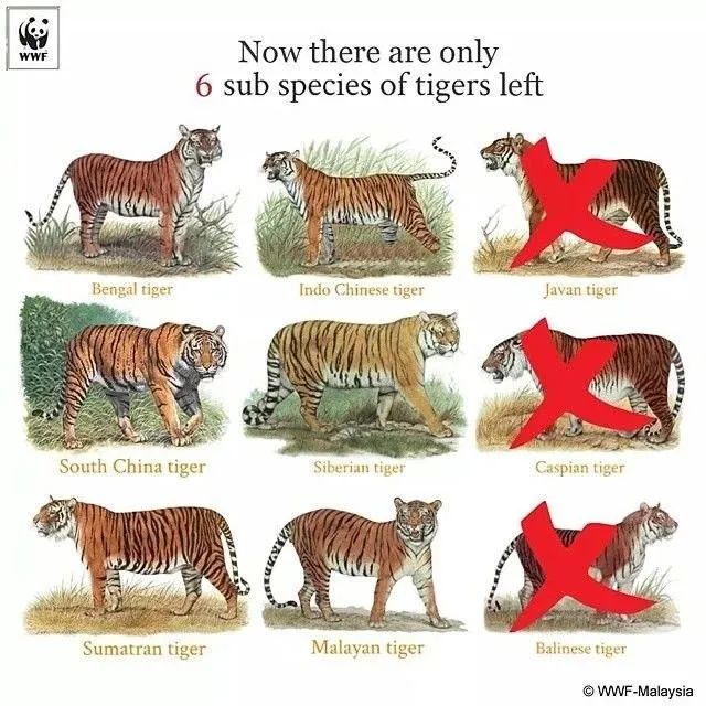 遺憾的是,巴釐虎、爪哇虎和裏海虎已經滅絕,目前我國境內也僅有東北虎有穩定存在的記錄,而華南虎則已接近野外滅絕,孟加拉虎和印支虎只有西藏、雲南邊境地區有過零星記錄。