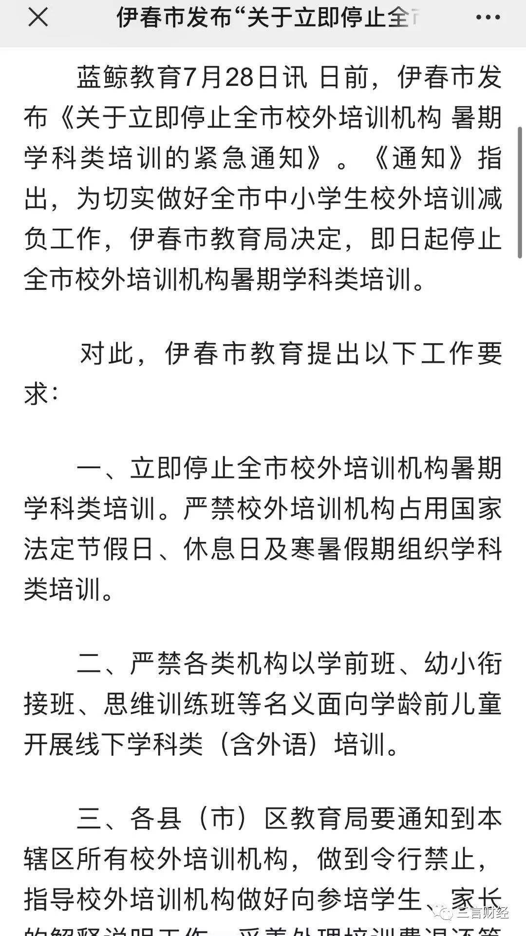 7月26日,黑龍江伊春市教育局宣佈,即日起停止全市校外培訓機構暑期學科類培訓。