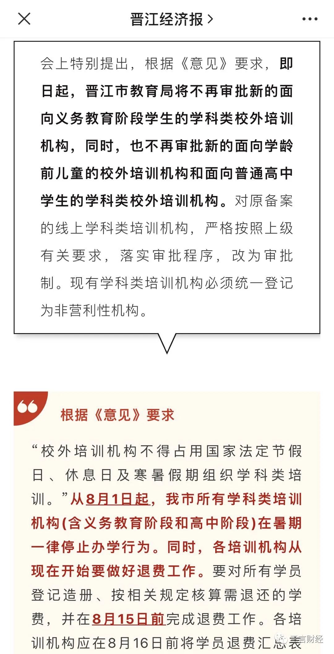 福建晉江市教育局要求,從8月1日起,所有學科類培訓機構(含義務教育階段和高中階段)在暑期一律停止辦學行為。同時,各培訓機構從現在開始要做好退費工作,在8月15日前完成退費工作。