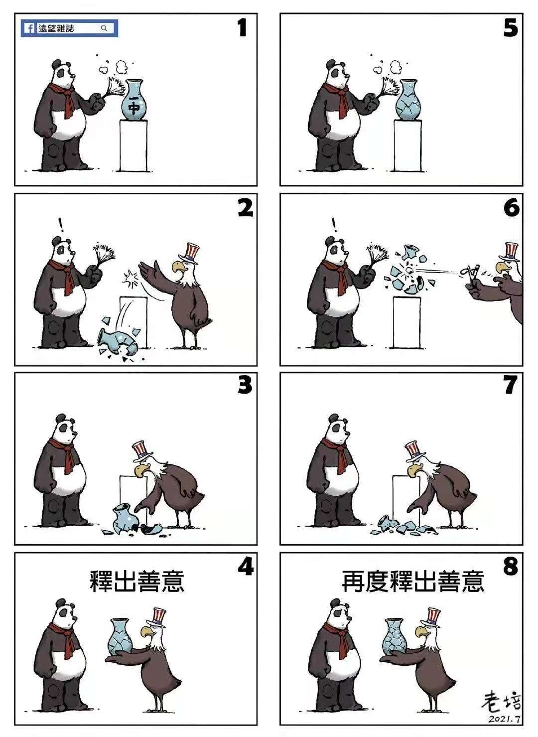 台灣政治漫畫家**老培(微博@台灣之胱漫書作者)**就用一副漫畫,揭露出了美國在台灣問題上的反覆無常,虛偽做作,將台海局勢逼到了不可收拾的境地。