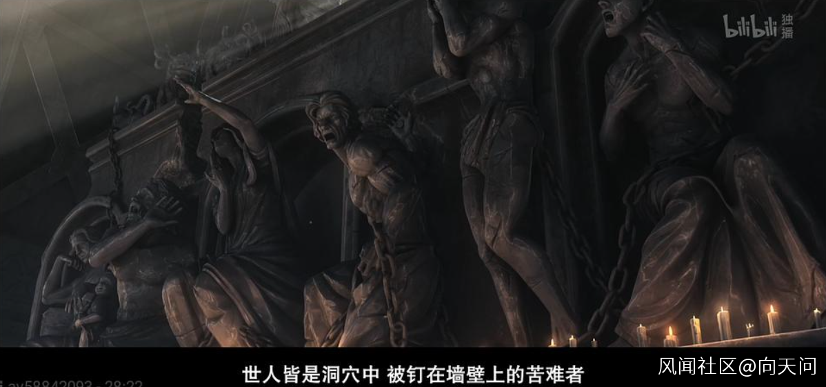 光影教信奉一個叫做光影之主的神明,教義是柏拉圖的洞穴之喻,説實話這個我沒深入研究,應該隱喻了些東西,只是第八集的廢墟里有散落一地的雜誌,其中一本叫做《深瞳》的我查了一下,恰好是一本中國科幻小説,主題講的就是洞穴之喻,這裏就不細説了。