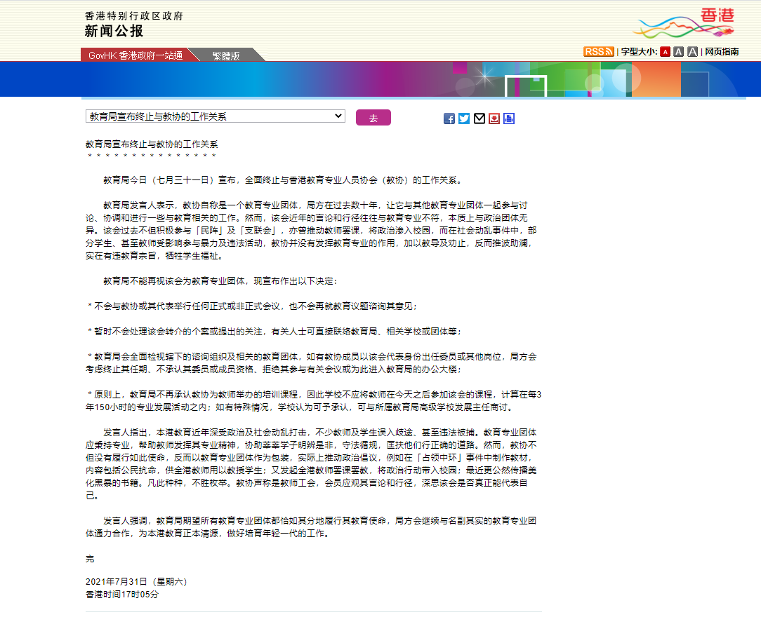 香港特區政府31日發佈新聞公報稱,香港教育局今日(31日)宣佈,全面終止與“香港教育專業人員協會(教協)”的工作關係,不再視其為教育專業團體。