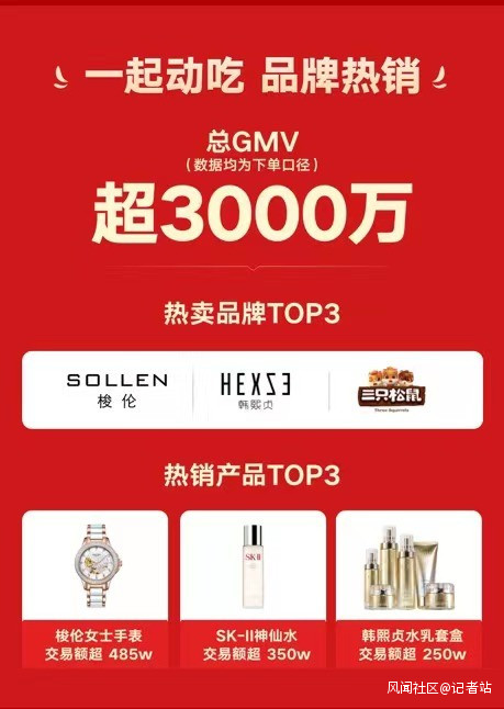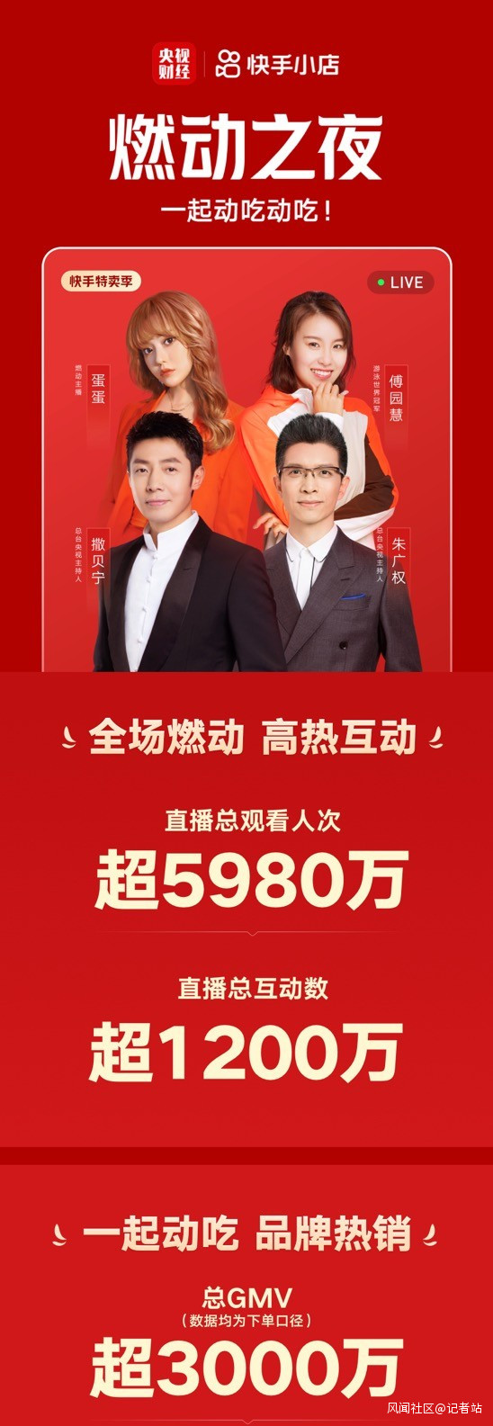 7月29日晚6點-9點,央視主持人撒貝寧、朱廣權跨界擔當“金牌推銷員”,攜手快手平台辛選主播蛋蛋、游泳世界冠軍傅園慧亮相“燃動之夜”直播間,一起“動吃動吃”,為觀眾帶來一場饕餮盛宴。本場直播以超3000萬的銷售額完美收官,超過5980萬人次收看了本場直播,互動數量突破1200萬。