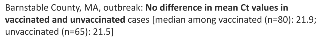 CDC內部文件中引爆輿論的最重要消息,恐怕就是打了疫苗之後感染Delta變異株的患者,病毒載量與沒打疫苗的感染者無差異。的確,文件中確實有這麼一段(見下圖),CDC甚至自己加粗了這個“無差異”。