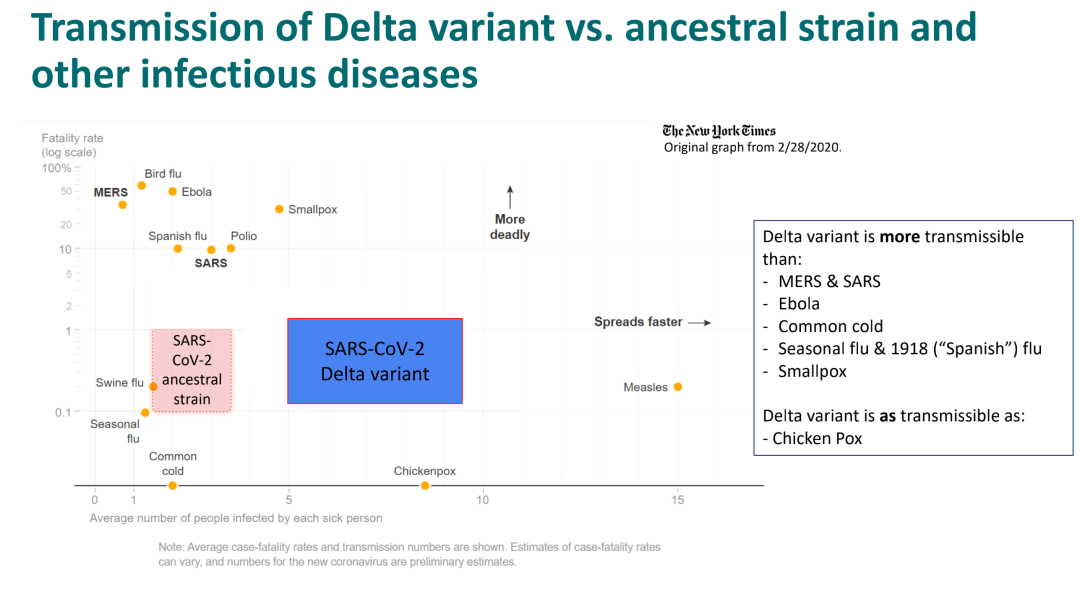 Delta變異株的傳播性不僅強於野生型新冠,也強於SARS、MERS、Ebola、普通感冒、流感和天花。與它有類似傳播能力的水痘,致死性遠遠低於它。