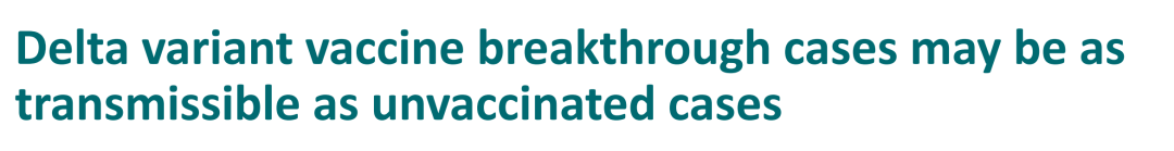 當地時間7月30日,美國CDC(以下簡稱CDC)一份關於Delta變異株與疫苗有效性的文件被媒體曝光,隨後,CDC在官網公佈了這份文件的詳情,提示我們:Delta變異株傳播能力極強,突破美國現有疫苗的能力也較其它變異株更強,並且證實了一個讓人擔憂的事實——完成疫苗接種後,感染Delta變異株的人羣,與沒有接種的感染者相比,病毒載量無明顯差異。CDC指出,這些接種過疫苗的感染者同樣具備傳播疫情的能力,並且提出應當改變防疫策略,接種疫苗的人羣也應注意防護,戴上口罩。