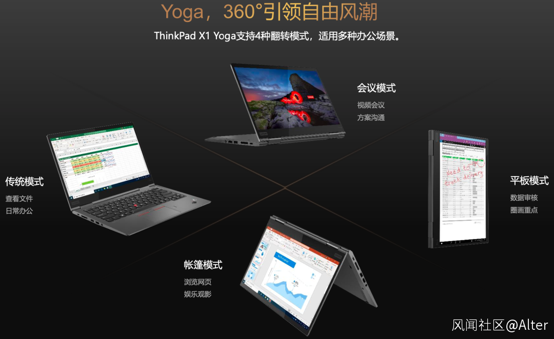 即便是到了輕薄本大爆發的2021年,ThinkPad X1 Yoga照舊憑藉1.39Kg的機身重量、一體式的轉軸結構、卓越的性能征服了商務人羣。特別是一體式轉軸結構的巧妙設計,可以同時滿足傳統模式、帳篷模式、平板模式、會議模式等多種辦公場景,準確洞察到了當前商務人羣多元化的訴求。