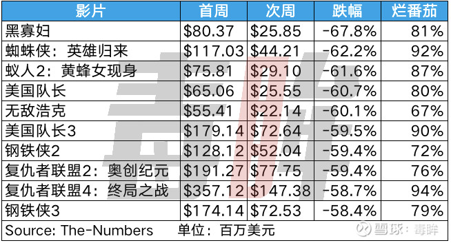 在“漫威電影宇宙”內部,《黑寡婦》的次周跌幅高居榜首,超過了《蜘蛛俠:英雄歸來》(-62.2%)和《蟻人2:黃蜂女現身》(-61.6%)。除這三部之外,僅有早期的《美國隊長》和《無敵浩克》曾出現60%以上的跌幅。這些影片都僅在頭名位置上待了一週時間,成為“漫威電影宇宙”24部作品中的少數派。公映第三週《黑寡婦》的跌幅依然達到55%,北美衝擊2億美元的目標已經岌岌可危。