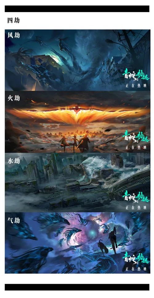 修羅城內四劫輪迴,劫起是為了清除修羅城內不願輪迴的眾生。每一劫中還出現了中國古代神話中的神獸,風劫中出現的飛廉就是傳統神話中人面鳥身的風神;隨火劫而來的畢方鳥則是中國傳統神話中的大火之兆;水劫和氣劫的神獸都取材自**《山海經》,水劫中的出現的是玄龜**、而氣劫中是鰼鰼魚。