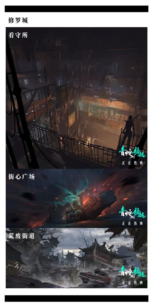 **黃家康導演:**其實我們在做修羅城的這個概念的時候,確立的方向是:修羅城是一個生跟死之間的空間,所以這不是一個普通的、比較常見的空間,這是一個由眾生求而不得的“執念”而生的地方,所以整體架構成“銜尾蛇”也是貼合“輪迴”這個概念。這裏沒有時間的概念,所有各個年代的放不下“執念“的人或妖都會墜入這裏。