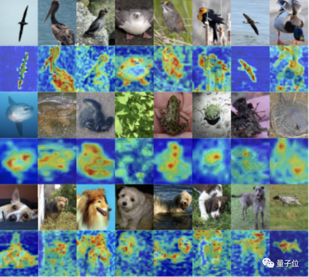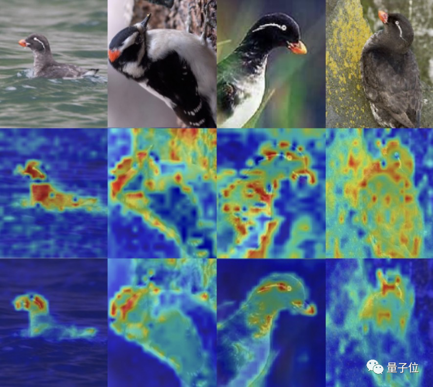 下圖為RAMS-Trans在識別鳥類時根據注意力權重生成的注意圖(attention map)。