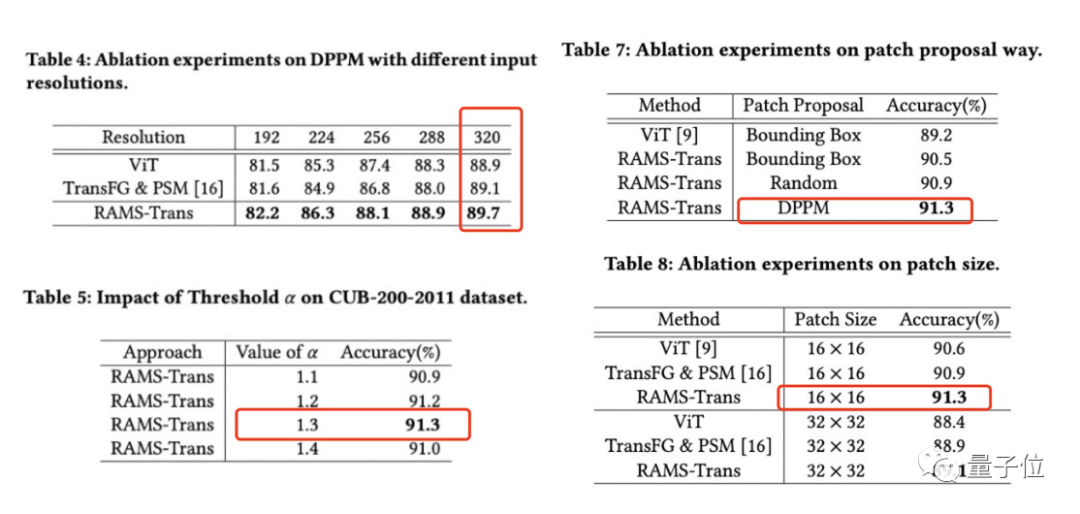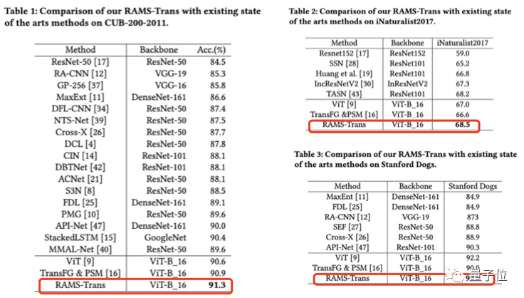 實驗表明,除了高效的CNN模型外,RAMS-Trans的表現比同期進行的工作更好,分別在CUB-200-2011(鳥類識別)、Stanford Dogs(狗類識別)、iNaturalist2017(動植物識別)獲得SOTA。