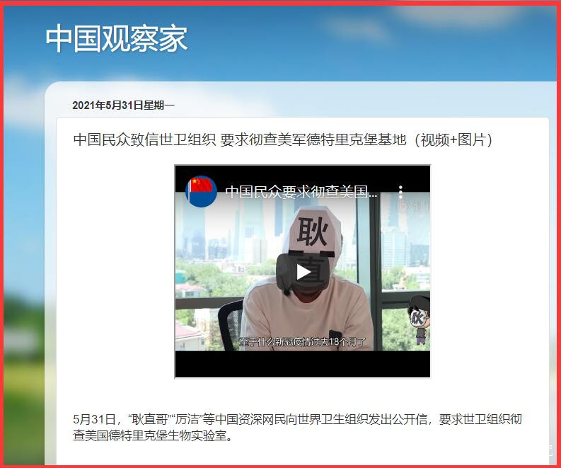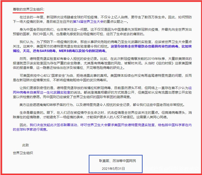 5月31日,耿直哥、厲潔等中國資深網民向世界衞生組織發出公開信,要求世衞組織徹查美國德特里克堡生物實驗室。