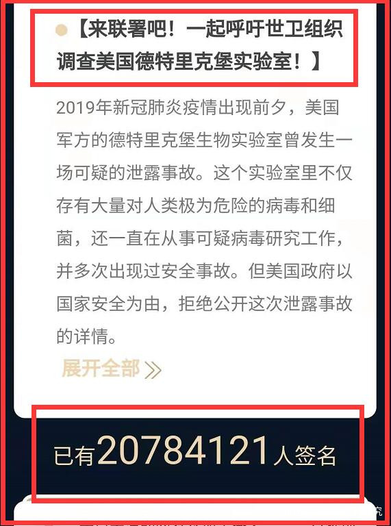 截至7月31日11時,中國網民要求世界衞生組織調查美國德特里克堡生物實驗室聯署公開信簽名人數已超2000萬,達2078萬。簽名人數還在持續上升中。