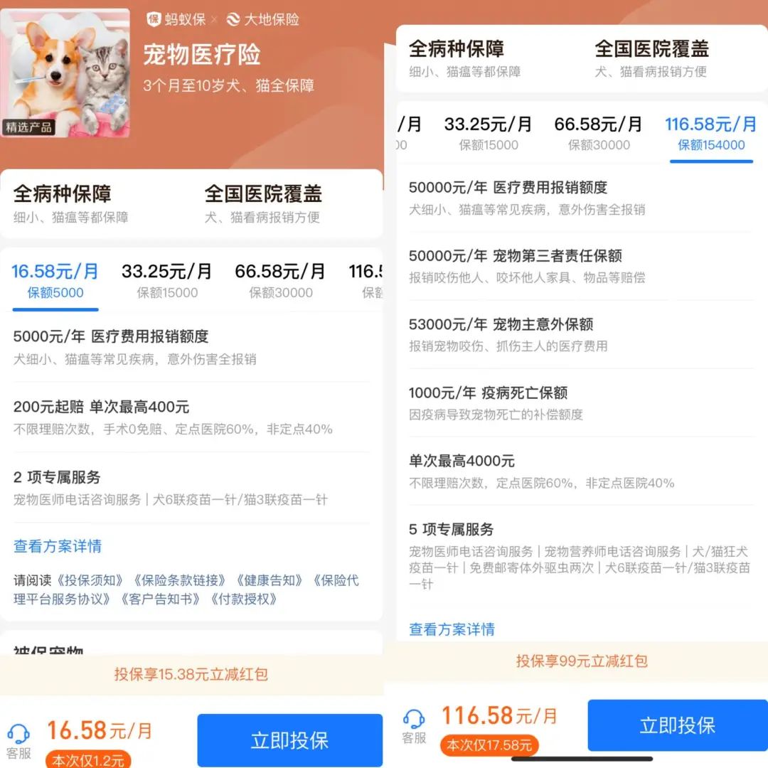螞蟻保和大地保險合作推出了一款寵物醫療險,最便宜的每月16.58元,最貴的每月116.58元,算下來每年在寵物保險上的花銷少則近百元,多則上千元。