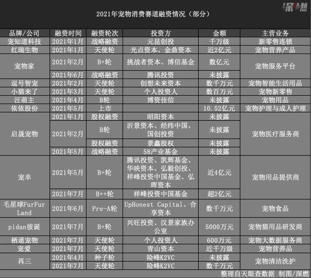 養寵物的人越來越多,賺寵物錢的人也越來越多。資本也盯上了這個賽道,深燃整理公開數據發現,今年1-7月,寵物賽道融資事件已有20餘起,其中有品牌單次融資金額過億,還有品牌在短短半年內融資三輪。