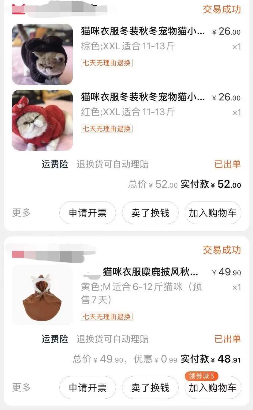 幾位鏟屎官對深燃總結自己買過最多的寵物用品,大都提到了玩具和衣服。“衣服種類太多了,抖音上總有穿着好看小衣服的貓貓狗狗,説不動心是假的。”鏟屎官菲菲表示,給貓買衣服像給她自己買衣服一樣衝動。