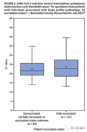 接種疫苗和未接種疫苗的人之間的Ct值幾乎沒有差別。 完全接種疫苗的病人的Ct值為22.77,而未接種疫苗組的Ct值為21.54。理想情況下,接種疫苗者中的數字應該高於35,並接近40,這將表明病毒的水平很低。