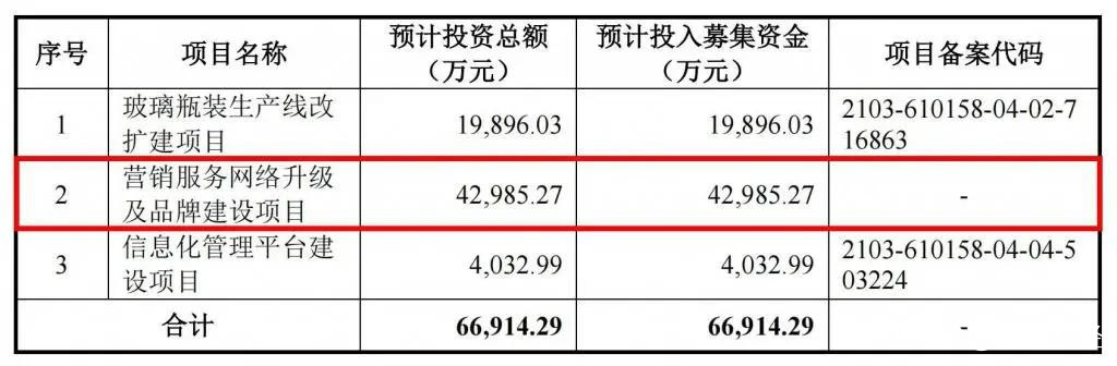 招股書顯示,冰峯飲料擬將1.99億元用於玻璃瓶裝生產線改擴建項目,佔比29.73%;4.3億元用於營銷服務網絡升級、品牌建設項目,佔比64.24%。