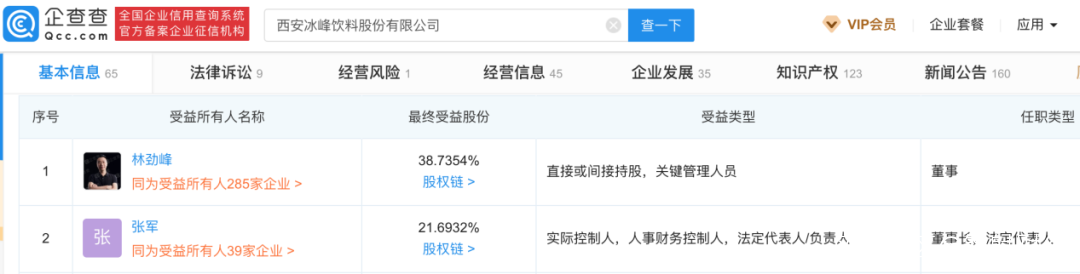 企查查顯示,糖酒集團持有冰峯飲料99%股權,還通過全資子公司——久悦酒業持股1%。糖酒集團董事長兼總經理張軍,同時擔任冰峯飲料董事長職務,最終持股21.70%。盈信投資集團董事長林勁峯間接持股38.73%。