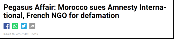 摩洛哥政府率先作出否認,稱相關指控“毫無根據”,並在事發第三天的7月22日,又對法國非營利記者組織“禁忌故事”(Forbidden Stories)和總部位於倫敦的非政府組織“大赦國際”提起誹謗訴訟,原因是上述兩個組織最先對摩洛哥作出不實指控。