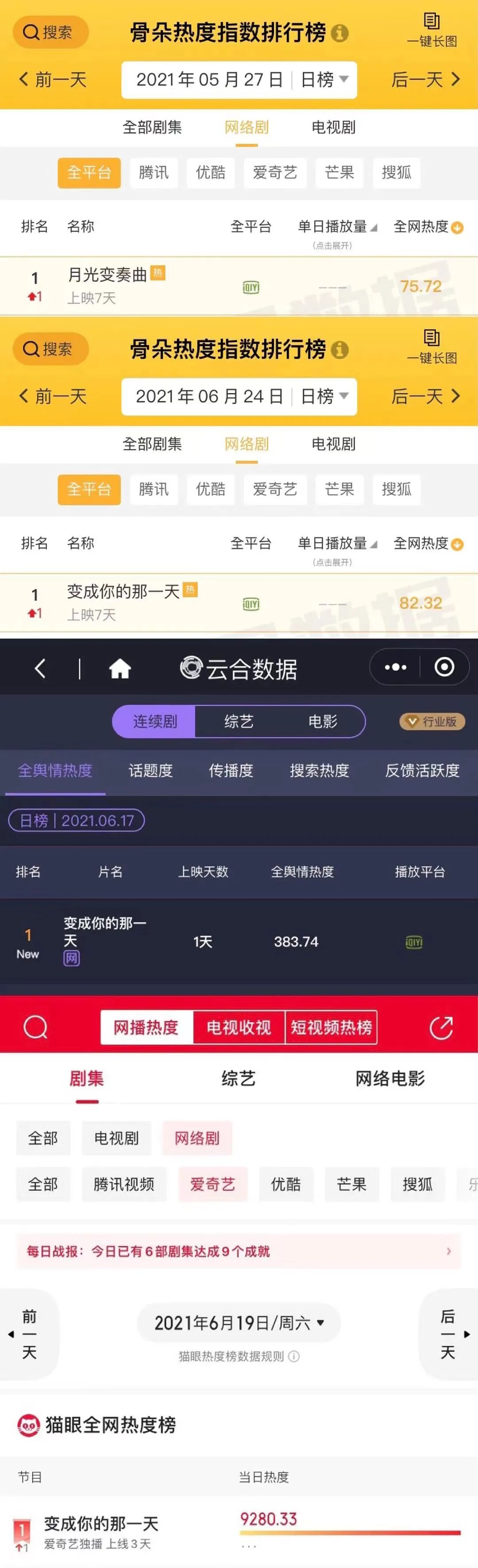 而最近熱播的戀戀劇場,不僅有剛剛上線的《循環初戀》以“回到未來”式的奇想設定迅速引起市場關注,更有之前表現突出的《月光變奏曲》和《變成你的那一天》,長期霸榜愛奇藝熱播榜前五,連續多日位列骨朵、貓眼、雲合數據等第三方劇集榜首位。每當一部劇臨近收官,就有觀眾帶上#戀戀劇場#微博話題催更下一部,追劇熱情可見一斑。