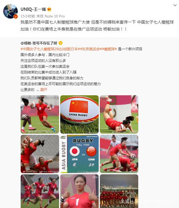 當然,和很多大家耳熟能詳的運動相比,女子七人制橄欖球在中國還屬於冷門項目——29-0戰勝日本後,球員楊敏發文慶祝勝利並喊話偶像王一博,希望他能成為“中國七人制橄欖球推廣大使”。**王一博回應説,“我雖然不是中國七人制橄欖球推廣大使,但是不妨礙我來宣傳一下,中國女子七人橄欖球加油!你們在賽場上本身就是在推廣這項運動,楊敏加油!”**楊敏隨後轉發,並對自己的偶像表達了感謝:“你的轉發就是對我們最好的支持,我們會繼續努力的,我和我的隊友都很喜歡你。”追星成功了,但接下去這個項目該如何發展,依舊需要中國體育穩紮穩打,走好每一步。