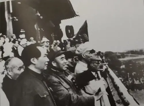 在臨時搭建的觀禮台上,來自蘇聯的代表格外引人注目。他們是蘇聯文化藝術團,遠道而來參加新中國成立慶典。團長是法捷耶夫和西蒙諾夫。紅軍歌舞團、攝影隊與他同行。當他們看到人民解放軍軍旗引導着海軍、步兵、坦克兵團、騎兵兵團、炮兵兵團走過檢閲台時,也和我們一樣鼓掌,並高呼“烏拉”……