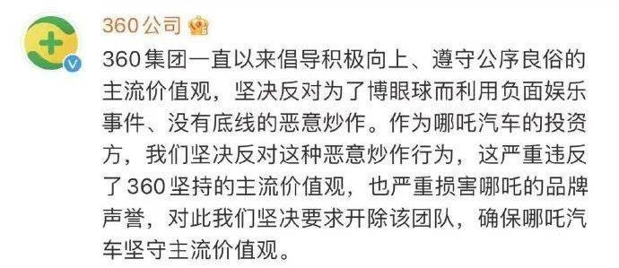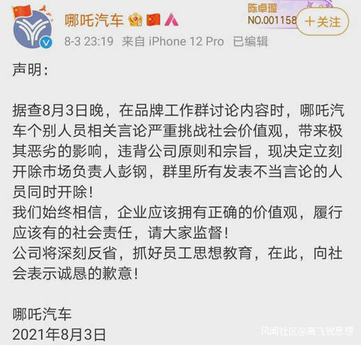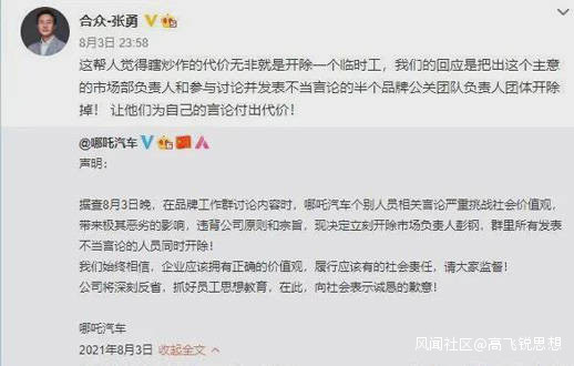 值得慶幸,哪吒汽車還是有理智者存在,沒有讓彭鋼來主導這件事情。投資方360公司通過官微發佈聲明,表示堅決反對沒有底線的惡意炒作,堅決要求開除該團隊。哪吒汽車CEO張勇表示“開除相關責任人及參與談論該言論的公關團隊。”。8月3日,哪吒汽車發佈聲明,稱個別人員相關言論嚴重挑戰社會價值觀,帶來極其惡劣的影響,立刻開除市場負責人彭鋼,羣裏所有發表不當言論的人員同時開除。