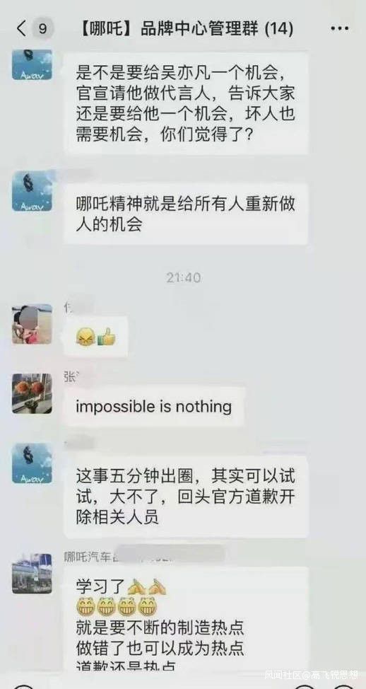 但哪吒汽車不知是蹭熱度,還是真心想給他一次悔過自新,重新做人的機會,哪吒市場負責人彭鋼在一個14人的工作羣裏建議請吳亦凡做代言人,稱壞人也需要機會,表示“哪吒精神就是給所有人重新做人的機會”,隨後彭鋼補充了:“這事五分鐘出圈,其實可以試試,大不了回頭官方道歉開除相關人員。”他的建議還得到了奉承和響應,被認為是太高明瞭。
