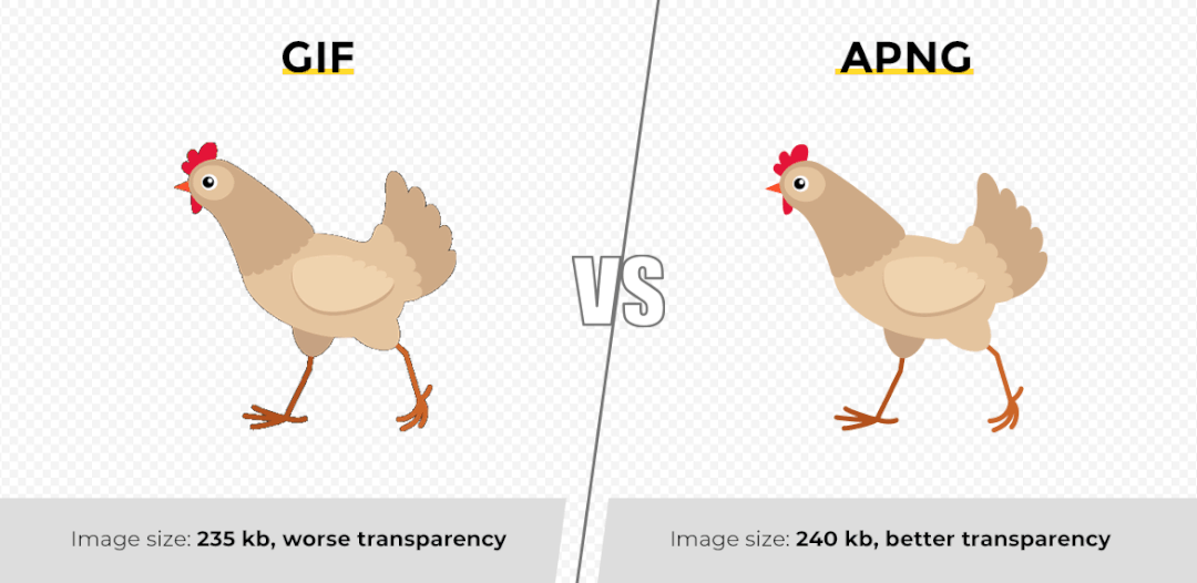 再結合優異的壓縮算法, apng 在文件大小和 gif 相似的情況下,圖片質量要更高,而且即使不加載整個動圖也能預覽第一張。