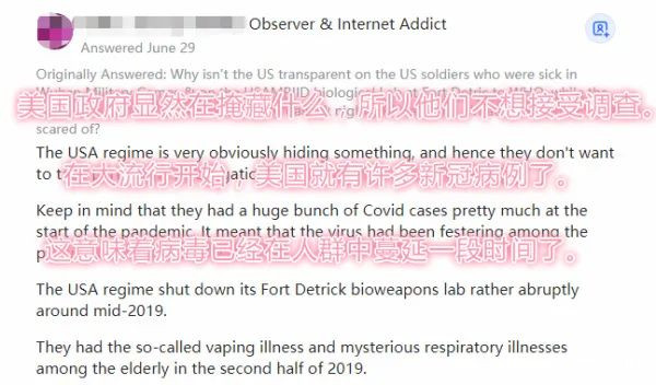 再看看美國在線交流平台,“為什麼不調查德特里克堡?”“為什麼美國天天叫喊要對新冠溯源問題透明,美國自己卻不透明,在害怕什麼?”等帖子連續幾個月受到外國網友的廣泛關注。