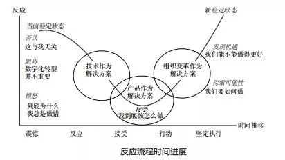 組織也是如此,脱離舒適慣性後,隨着時間推移會經歷一個震驚、反應、接受、行動、堅定執行的過程。