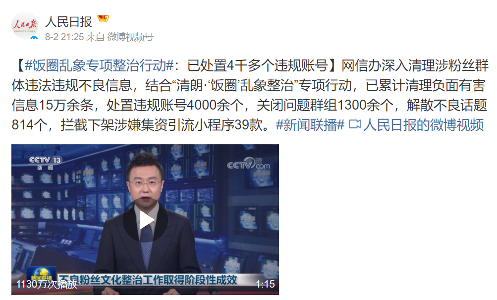 《人民日報》嚴厲表示,“正告畸形‘飯圈文化’的那些背後推手們,早些迷途知返”,否則“不僅最終可能顆粒無收,可能還要賠得傾家蕩產。”