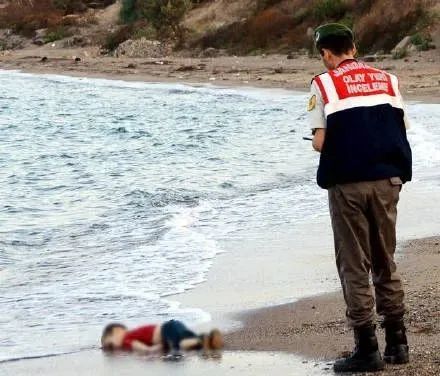 希臘海灘上,趴着溺亡的小孩臉埋進砂礫中,小小的身體被海浪一遍遍拍打。