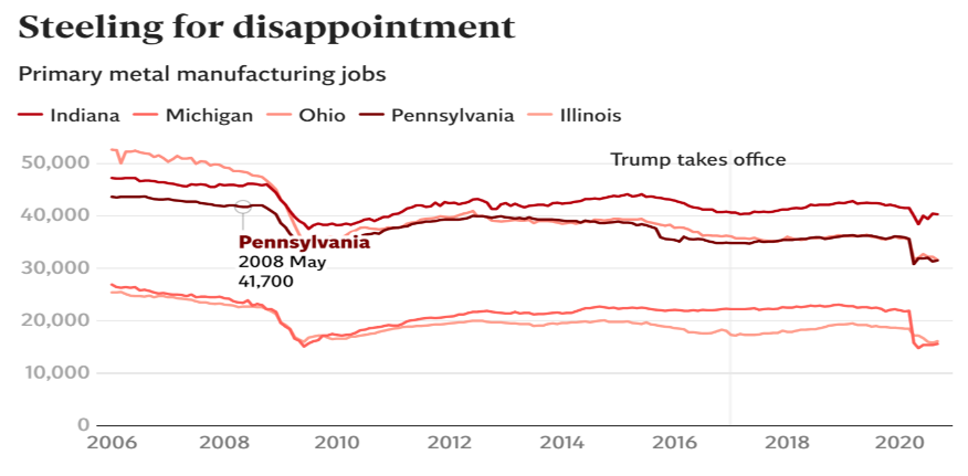 鐵鏽地帶與鋼鐵產業的相關性是不言而喻的。根據美國鋼鐵學會於2018年的統計數據,鐵鏽地帶中有5個州的鋼鐵產業產量和就業貢獻崗位數量在全美名列前茅:印第安納、賓夕法尼亞、密歇根、伊利諾伊和俄亥俄。然而我們可以看到在近年來,這些鐵鏽地帶州的工作崗位數量在逐漸減少,也就引發了鐵鏽帶州的鋼鐵產業工人的失落的問題。這也是舉世矚目的2016大選的重要國內背景。