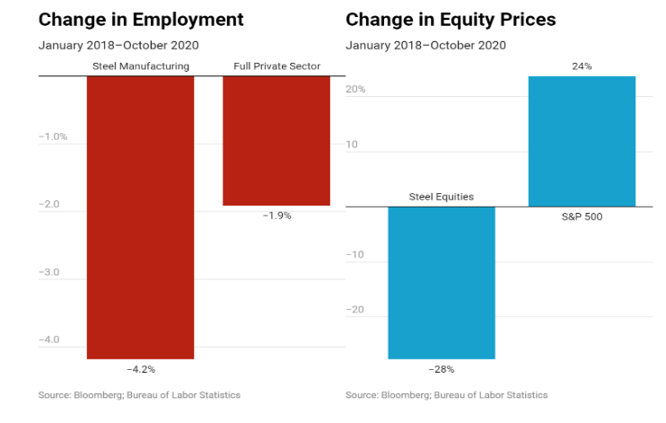 正是由於鐵鏽帶州對於總統選舉的特殊性以及特朗普競選成功的特殊現象,拜登也相較於過去的競選者更加關注這些州的利益訴求。利益集團政治和選舉政治的壓力使得拜登在貿易保護主義政策已經造成明顯的負面衝擊的情況下,仍然堅持延續這種政策。過去3-4年中,特朗普的貿易保護主義對於鋼鐵產業以及鐵鏽帶經濟都造成了較大的損害。我們可以看到,在特朗普實施徵收進口鋼鐵高關税措施之後,上述幾個州的就業狀況尤其是鋼鐵產業以及其他下游製造業的狀況則有所下降。而就美國鋼鐵產業本身而言,在2018年至2020年期間,該產業的就業率下降了4.2%,而鋼鐵股票價格也下跌了28%。如下圖所示: