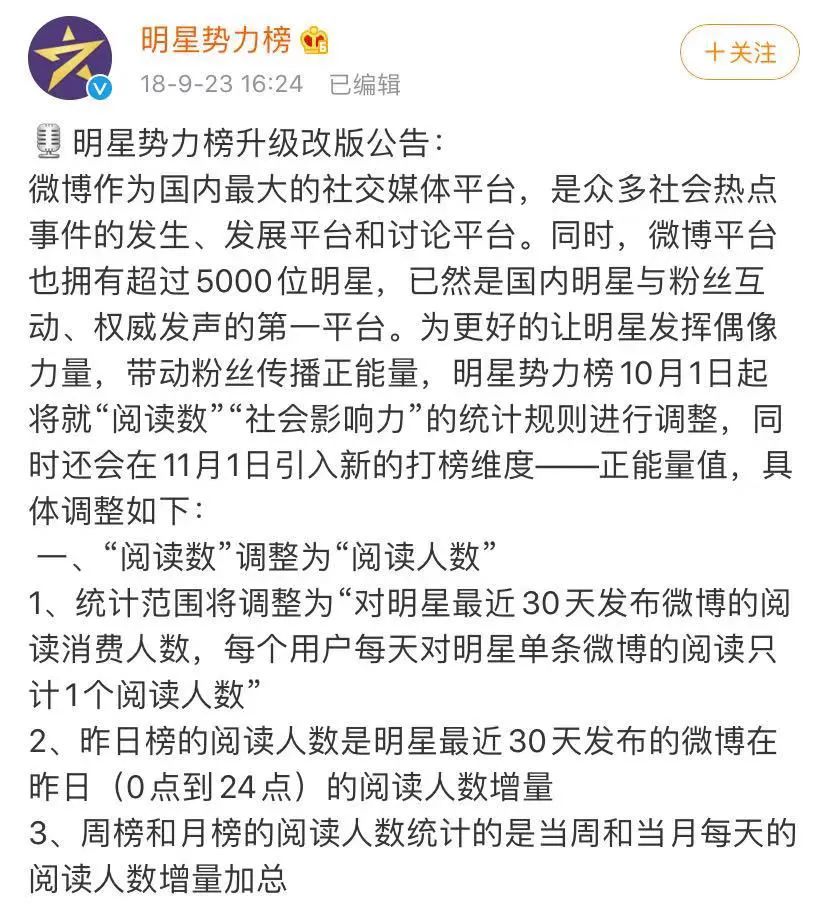 不久後,單人多次刷榜問題也嚴重起來,微博進一步升級了榜單規則,將“閲讀數”調整為“閲讀人數”,每個用户每天對明星單條微博的閲讀只記一次閲讀人數,且僅對明星某一時間段發佈的微博有效。同時,社會影響力裏提及的明星微博閲讀數,也調整為“閲讀人數”。