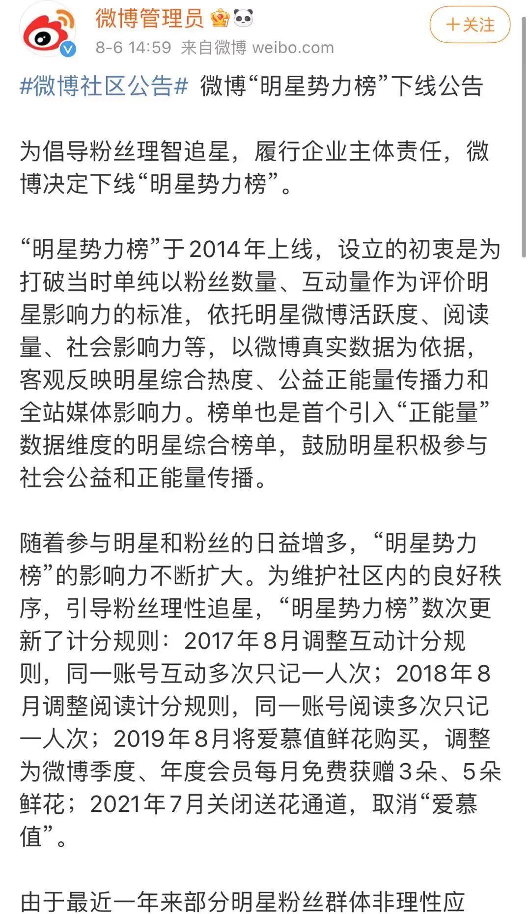 6月以來的“清朗·飯圈亂象整治”行動終於迎來了一個實質性的大動作,就在今天下午(8月6日),微博宣佈下線自己最重要的娛樂榜單之一——“明星勢力榜”。
