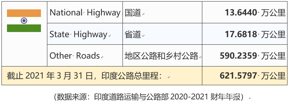隨着我的銷售工作和售出的築路設備,我幾乎跑遍了印度的不同地區,參與了很多NHDP的項目,對印度的道路狀況有一定的瞭解。印度的公路分為國道(National Highway),省道(State Highway),以及其他不同類型的道路。截止2021年3月31日,印度不同道路總里程如下表:
