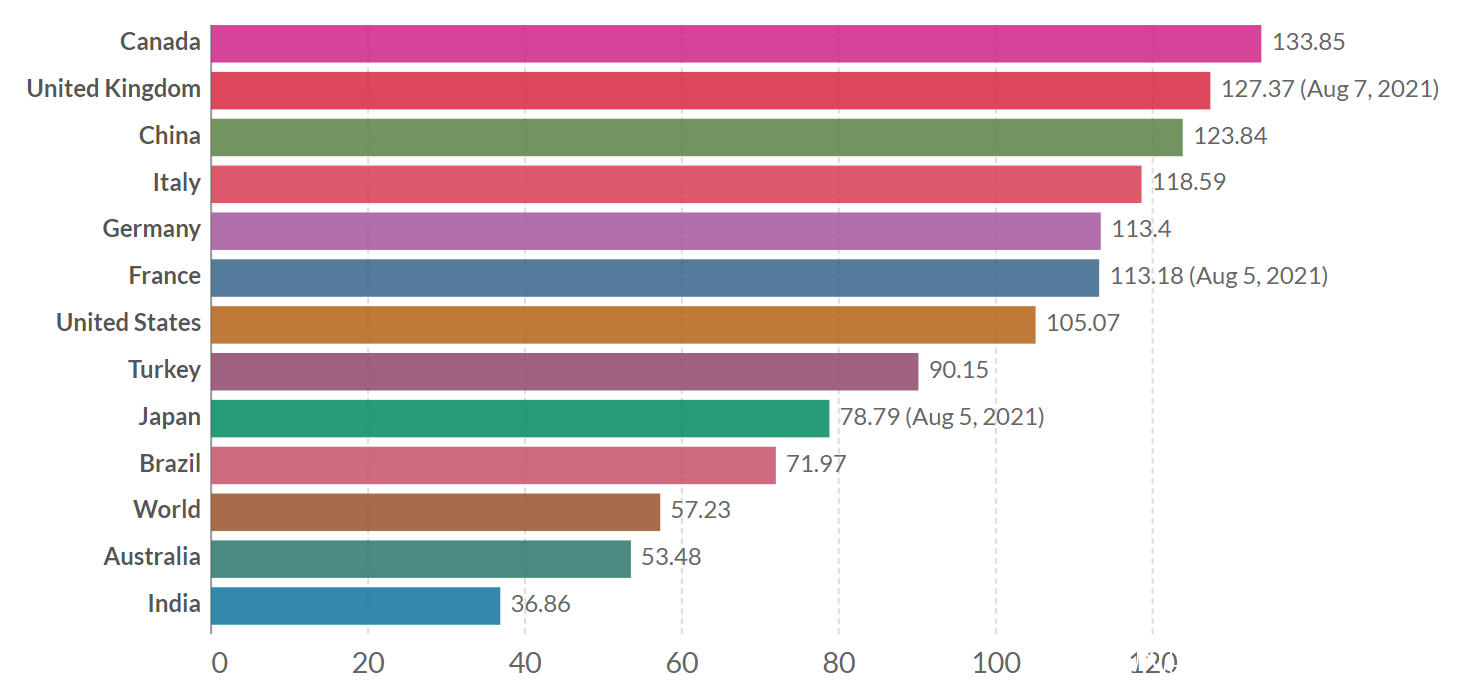 截止2021年8月8日,中國大陸累計接種新冠疫苗17.8253億劑,繼續位居全球第一位,佔全球累計接種劑數的40.0%;其中單日新增接種1222萬劑,佔全球單日接種劑數的47.6%。中國每百人累計接種126.26劑,環比增加0.86劑,是美國的1.20倍,在世界主要大國中僅次於加拿大(每百人133.85劑)和英國(每百人127.37劑)。
