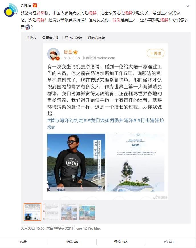 當時,網絡上有一批諸如“中國人的肉蛋奶消費,為什麼會影響到巴西熱帶雨林的存亡”,“中國人對海鮮貪得無厭的胃口,耗盡世界漁業資源”之類,打着環保名義,夾帶私貨的觀點出現。