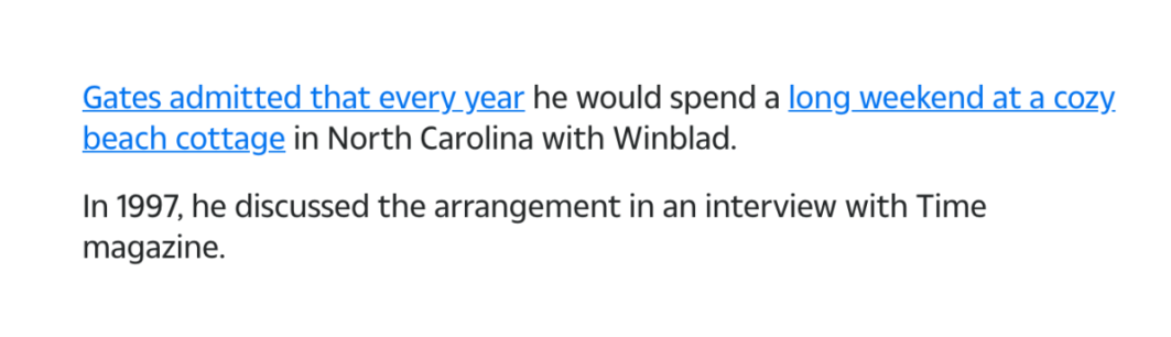 在1997年《時代週刊》的採訪裏,蓋茨公開承認,婚後他每年都會在春天飛去北卡羅來納州的別墅和温布拉德(前女友)一起度過: