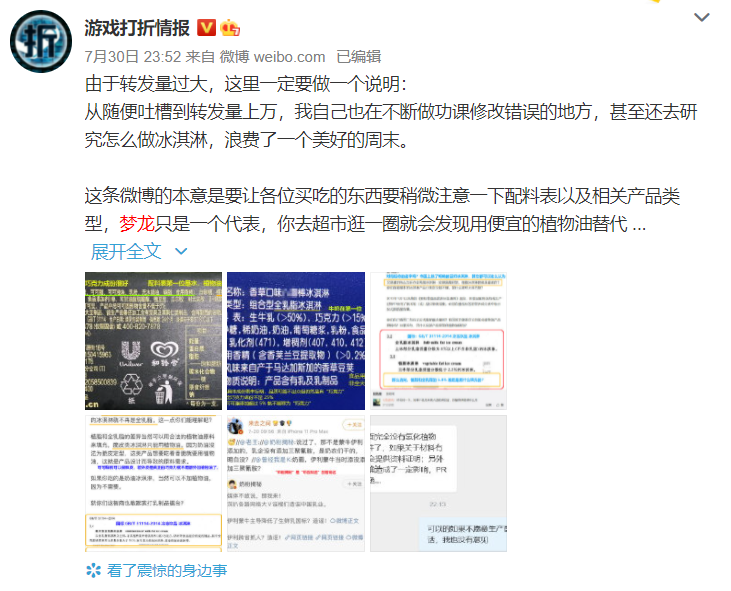 8月2日,網名為“遊戲打折情報”的網友通過社交平台爆料,夢龍國內版冰淇淋外面的一層巧克力和其它地區一樣,“都是來自比利時的可可脂”,但“國內版裏面包的冰淇淋,卻是大比例人造植物奶油,只有少量的奶粉”。