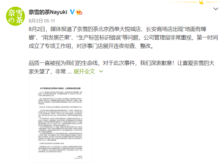 8月3日凌晨5點,奈雪在其官方微博上發佈道歉聲明,並表示,“公司管理層非常重視,第一時間成立了專項工作組,對涉事門店展開連夜徹查、整改。涉事的兩家門店今天將暫停營業,同時會邀請市場監督管理局上門檢查,並第一時間公佈檢查結果。”