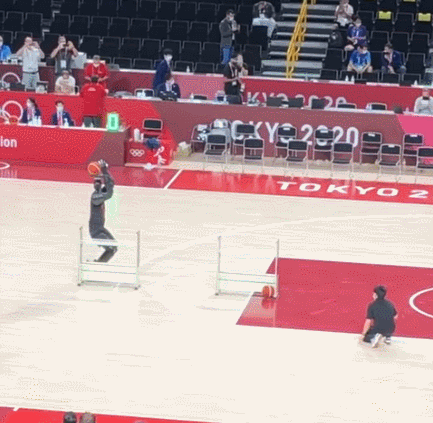 在美國對陣法國的籃球小組賽中,中場休息時就有一名籃球機器人站到了罰球線上。這台身着95號球衣的AI機器人CUE5,模擬着人體的投籃動作,在罰球線、三分線和半場處都能精確計算出動作幅度,準確完成投籃動作。